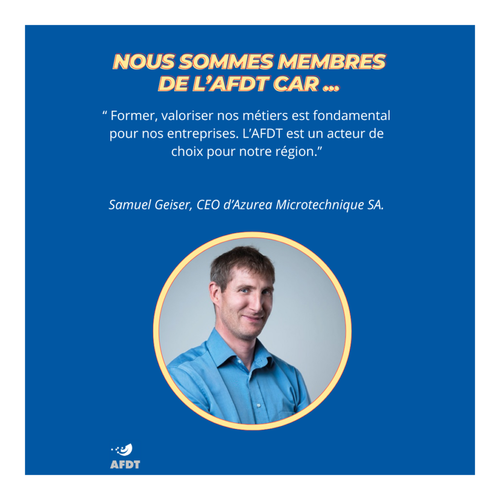 12 Juin News Les membres de l’AFDT prennent la parole 12 juin 2024 Posted by Joelle Schneiter Nous sommes ravis de partager le témoignage de Samuel Geiser, CEO d'Azurea Microtechnique SA . C’est un honneur de voir nos membres exp... Continue reading