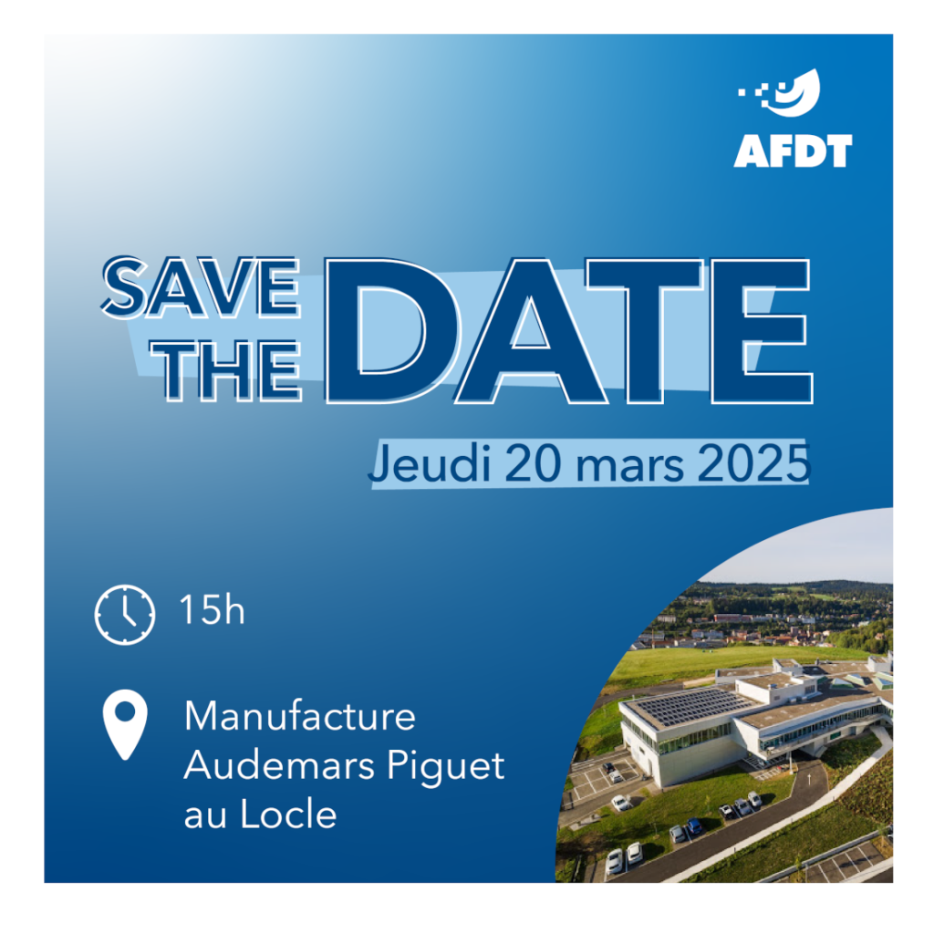 06 Mar News J-13 avant notre Assemblée Générale ! 6 mars 2025 Posted by Joelle Schneiter Plus que quelques semaines avant l’Assemblée Générale de l’AFDT, qui se tiendra le jeudi 20 mars 2025 à la Manufacture D'Horlogerie Aud... Continue reading